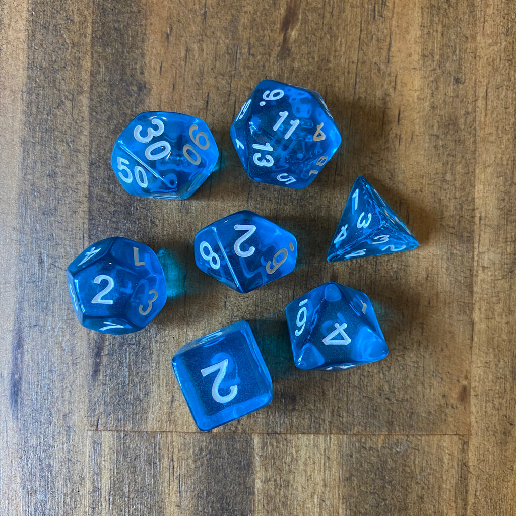 Una joya única obtenida de las criaturas mágicas más poderosas del mundo. Estos dados de color aquamarina capturan la esencia del iris de dragón, reflejando la magia ancestral en cada tirada. Cada set es un tesoro que solo los más valientes aventureros pueden obtener.